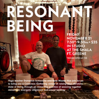 Yoga teacher Domenick Schiavone and Reiki Master Hue join forces to bring you a Conscious Gathering aimed at raising your vibratory state of Being through an immersive practice of weaving together movement, energetic alignment and sound healing.